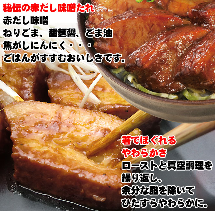 豚ばら肉(輸入)、砂糖、しょう油、みそ、ぶどう糖果糖液糖、発酵調味料、豚脂、ねりごま、清酒、水あめ、テンメンジャン、ごま油、食塩、おろしにんにく、おろししょうが、大豆たん白、乳たん白、にんにく、小麦たん白加水分解物、香辛料、ポークエキスパウダー / 調味料(アミノ酸等)、増粘剤(加工デンプン)、カラメル色素、リン酸塩(Na)、酸味料、キシロース、(一部に小麦・乳成分・ごま・大豆・豚肉・ゼラチンを含む)