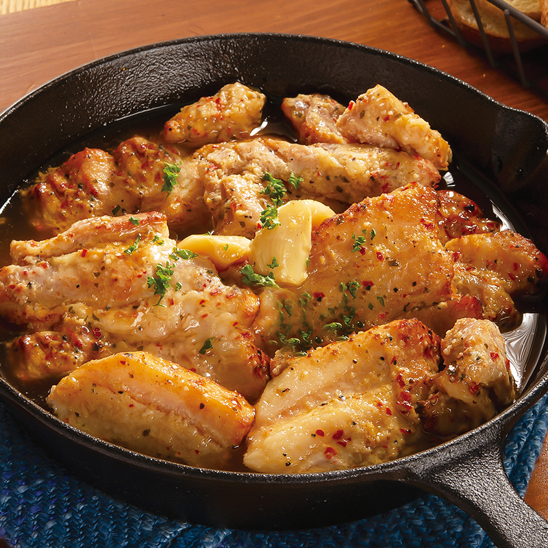 食べやすさ◎でイチオシの「骨なしスペアリブ」シリーズから、ビールやワインにはコレ!アヒージョ仕立ての骨なしスペアリブが新登場。カットした豚ばら肉に、スパイス&オリーブオイルを使用したオリジナルのオイルソースを加え真空調理でうま味をとじこめ、やわらかく仕上げました。丸ごと入ったにんにくの「ほくほく」としたおいしさに加え、<br>粗挽きにしたにんにくのパンチの効いた風味が全体に広がります。
