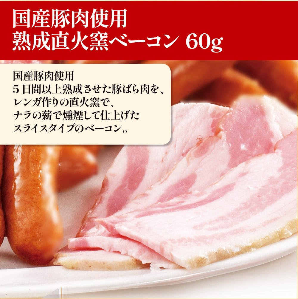 <国産豚肉使用 熟成 直火窯ベーコン>豚ばら肉(国産)、食塩、砂糖/リン酸塩(Na)、発色剤(亜硝酸Na)、(一部に豚肉を含む)