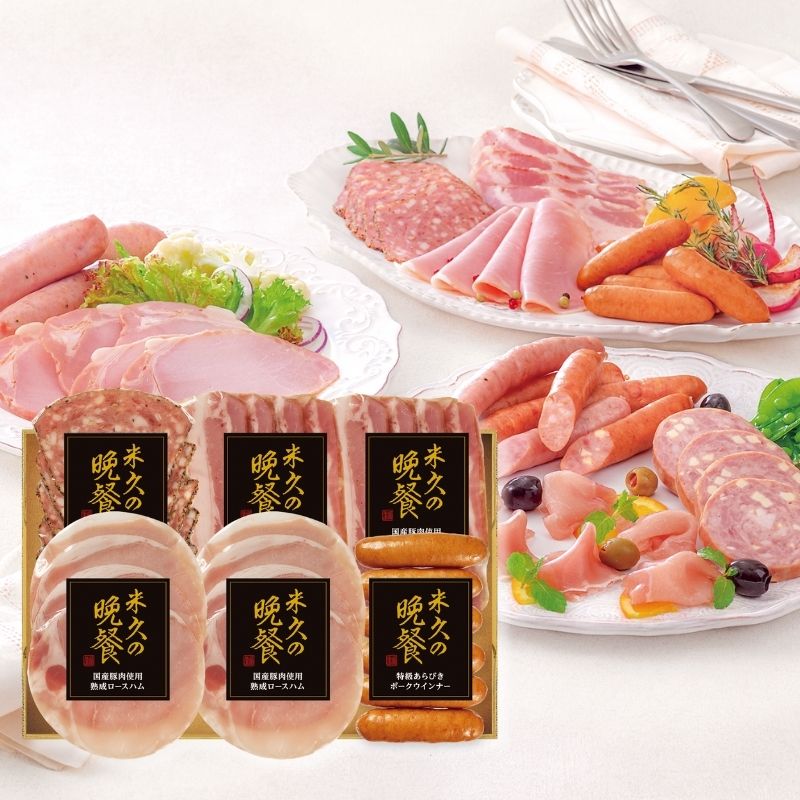<国産豚肉使用 熟成ロースハム> 豚ロース肉(国産)、食塩、砂糖/リン酸塩(Na)、調味料(アミノ酸等)、酸化防止剤(ビタミンC)、発色剤(亜硝酸Na)、(一部に豚肉を含む)