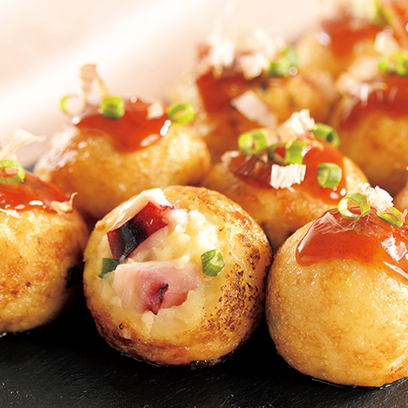たこ、小麦粉、キャベツ、でん粉、全卵、ねぎ、チキンエキス、しょうが加工品、ラード、しょう油、食塩、小麦たん白、大豆油、米粉、コーンフラワー / 調味料(アミノ酸等)、膨張剤、酸味料、香辛料抽出物、(一部に小麦・卵・大豆・鶏肉・豚肉を含む)