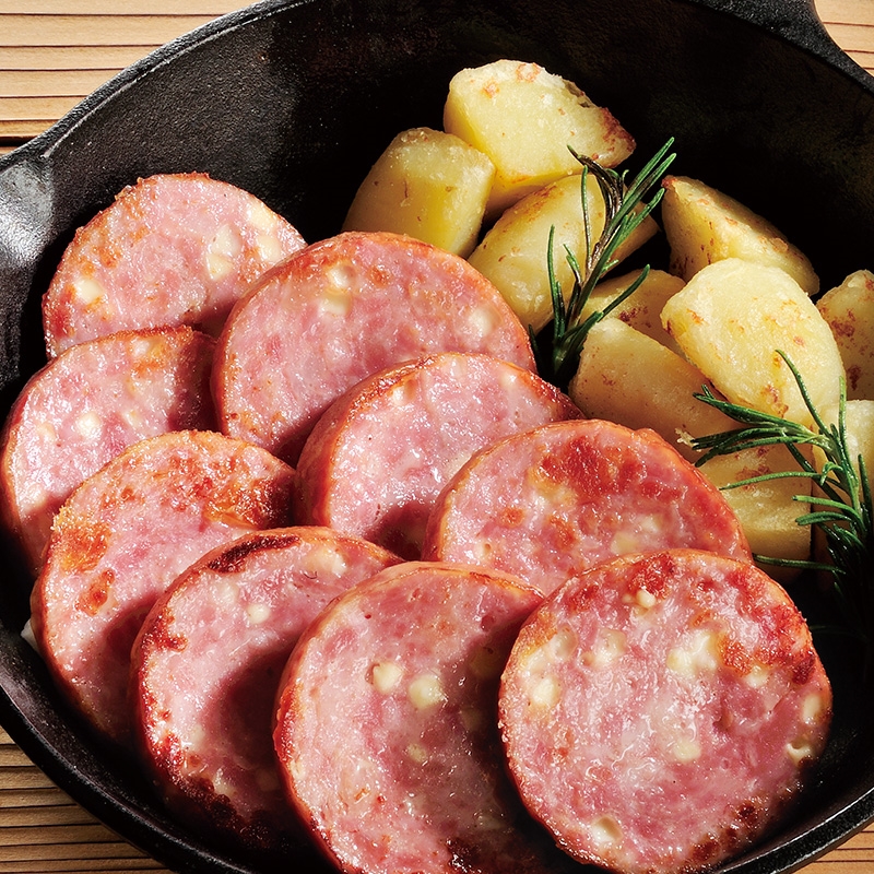 豚肉(国産)、豚脂肪、プロセスチーズ、食塩、香辛料、糖類(ぶどう糖、砂糖) / 調味料(アミノ酸等)、リン酸塩(Na)、乳化剤、酸化防止剤(ビタミンC)、発色剤(亜硝酸Na)、香料