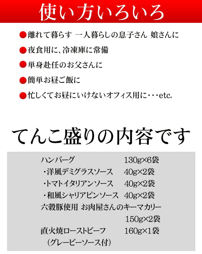 <六穀豚使用お肉屋さんのキーマカリー>豚肉(国産)、トマトピューレ、玉ねぎ(国産)、豚脂、ココナッツミルクパウダー、香辛料、食塩、しょう油、おろしにんにく、おろししょうが、にんにく、発酵調味料、砂糖、ぶどう糖果糖液糖、清酒、小麦たん白加水分解物、水あめ、ポークエキスパウダー / 調味料(アミノ酸等)、カラメル色素、増粘剤(加工デンプン)、酸味料、キシロース、(一部に小麦・乳成分・大豆・豚肉・ゼラチンを含む) <直火焼ローストビーフ たれ付 >