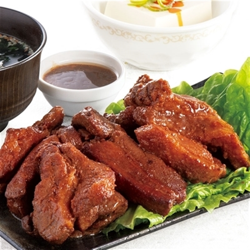 豚ばら肉(輸入)、砂糖、植物油脂、粉末しょう油、ぶどう糖果糖液糖、香辛料、トウバンジャン、おろしにんにく、水あめ、しょう油、食塩、大豆たん白、乳たん白/カラメル色素、調味料(アミノ酸等)、pH調整剤、カゼインNa、リン酸塩(Na)、キシロース、増粘剤(キサンタン)、酸味料、(一部に小麦・乳成分・ごま・大豆・豚肉を含む)