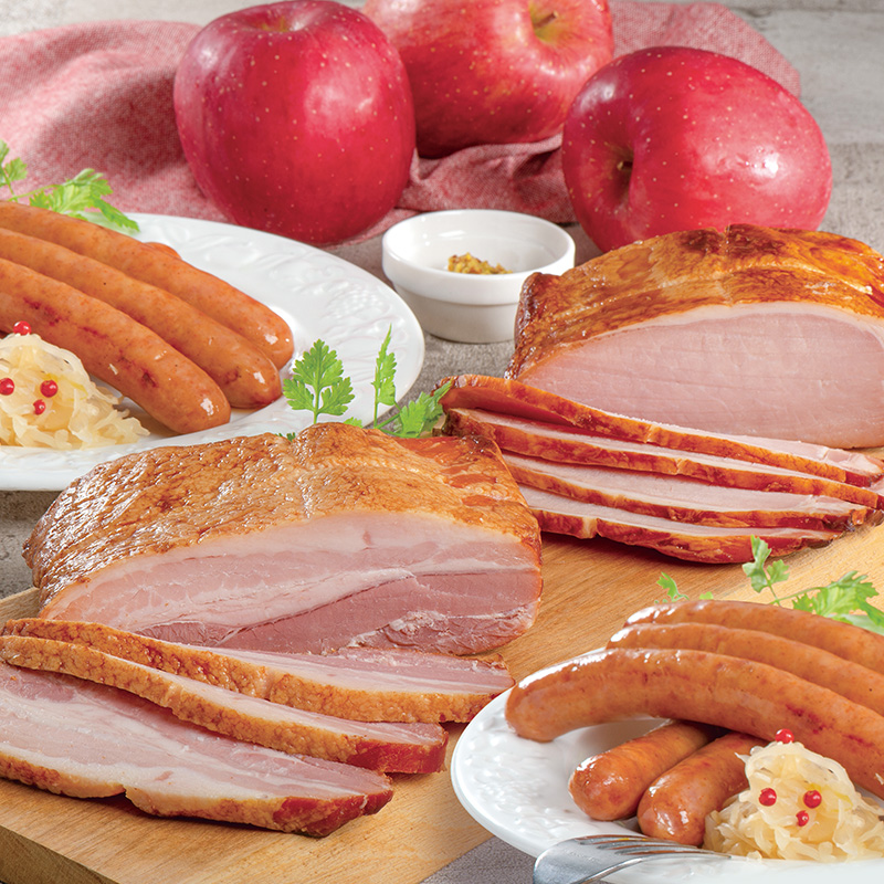 <ハニーローストアップルハム>豚ロース肉を精製はちみつ、リンゴ果汁などで味付けした後、高温で焼き、リンゴの木のチップで燻したしっとりやわらかなハム。