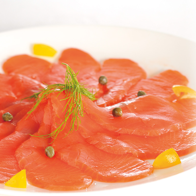 <スモークサーモントラウトスライス> サーモントラウト(原料原産地)、食塩、砂糖/調味料(有機酸等)、酸化防止剤(V.C)、(一部にさけを含む)