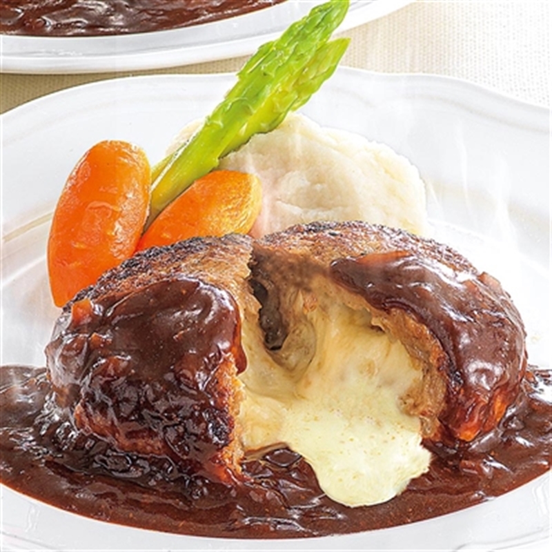 ※4種類のチーズ(チェダー、ゴーダ、パルメザン、カマンベール)をブレンドしたチーズフードを包んだハンバーグです。