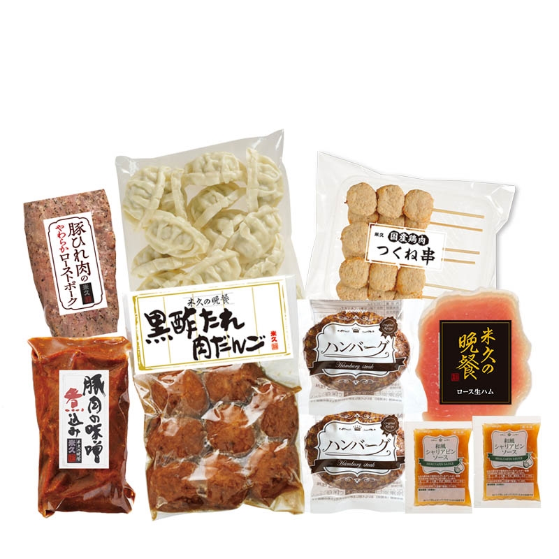 <和風シャリアピンソース>玉ねぎ(国産)、しょう油、砂糖、醸造酢、おろしにんにく、ポークエキスパウダー、食塩、植物油脂、ペッパーソース、香辛料 / 増粘剤(加工デンプン)、調味料(アミノ酸等)、酸味料、(一部に小麦・乳成分・大豆・豚肉・ゼラチンを含む)