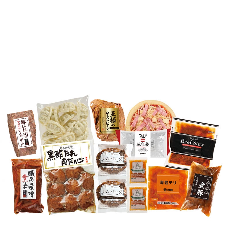 <ビーフシチュー>牛肉(アメリカ、オーストラリア)、玉ねぎ(国産)、ブラウンソース、トマトケチャップ、しょう油、赤ワイン、牛脂、ぶどう糖果糖液糖、バター、小麦粉、ビール、砂糖、おろしにんにく、マデラ酒、水あめ、野菜ブイヨン、醸造酢、オイスターソース、食塩、ポークエキスパウダー、チキンコンソメ、粉末状大豆たん白、乳たん白、香辛料、植物油脂 / 増粘剤(加工デンプン)、カラメル色素、調味料(アミノ酸等)、リン酸塩(Na)、pH調整剤、酸味料、香料、(一部に小麦・乳成分・牛肉・大豆・鶏肉・豚肉・ゼラチンを含む)
