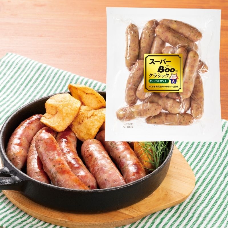 <スーパーBOOクラシック> 豚肉(輸入又は国産(5%未満))、豚脂肪、糖類(水あめ、ぶどう糖、砂糖)、食塩、香辛料/リン酸塩(Na)、調味料(アミノ酸)、酸化防止剤(ビタミンC)、発色剤(亜硝酸Na)、香辛料抽出物、(一部に豚肉を含む)