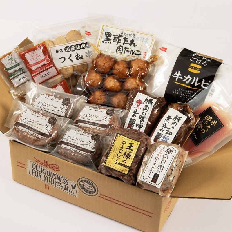 【黒酢たれ肉だんご】 食肉(鶏肉(国産)、豚肉(国産))、野菜(玉ねぎ(国産)、ねぎ)、つなぎ(パン粉、でん粉、粉末状大豆たん白)、豚脂、鶏皮、植物油脂、ぶどう糖、粒状大豆たん白、清酒、食塩、砂糖、かつお節エキス、香辛料、粉末濃縮スープ / 調味料(アミノ酸等)、リン酸塩(Na)、重曹、ソース(砂糖、しょう油、醸造酢、ぶどう糖果糖液糖、マンゴーピューレ、発酵調味料、黒酢、水あめ、ウスターソース、食塩、ごま油、小麦たん白加水分解物、オイスターソース / 増粘剤(加工デンプン)、カラメル色素、調味料(アミノ酸等)、甘味料(カンゾウ))、揚げ油(大豆油)、(一部に小麦・卵・乳成分・ごま・大豆・鶏肉・豚肉を含む)
